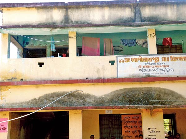 স্কুলে গিয়ে দেখা যায়, নিচু বারান্দায় চট পেতে সার দিয়ে বসে আছে পড়ুয়ারা। নীচে হেঁটে হেঁটে ক্লাস নিচ্ছেন শিক্ষক। সামনে চলছে মিড-ডে মিল রান্না। দোতলার ঘরের বারান্দায় সার দিয়ে ঝুলছে পুলিশের জামা, প্যান্ট, গেঞ্জি। স্কুলের লাগোয়া বাড়ি সেলিনা বিবির। তাঁর কথায়, ‘‘বাচ্চারা বাড়ি থেকে চটের বস্তা নিয়ে স্কুলে আসে। ঝড়বৃষ্টি হলেই চট বগলে নিয়ে ঘরের মধ্যে চলে যায়। বছর তিনেক থেকে এমনই দেখছি।’’