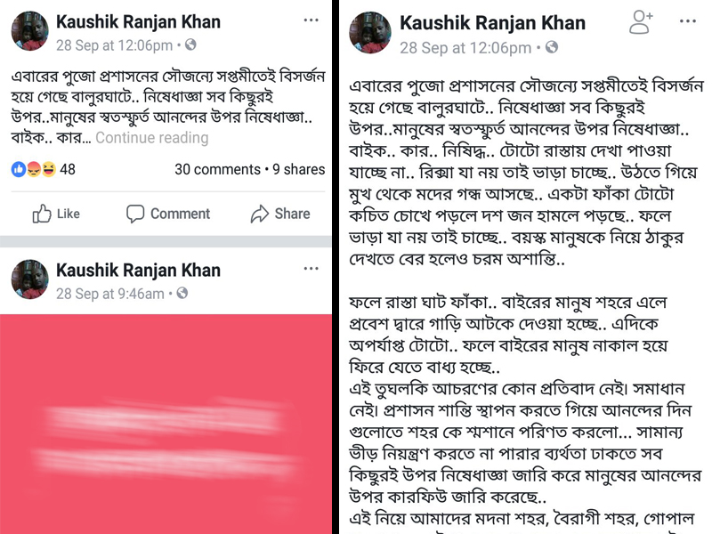 এই পদক্ষেপকে অনেকেরই ‘পুলিশি বাড়াবাড়ি’ বলে মনে হয়েছিল। তাঁরা সোশ্যাল মিডিয়ায় সরব হন পুলিশের বিরুদ্ধে। প্রতিবাদীদের অন্যতম বালুরঘাটের এক প্রাথমিক শিক্ষক কৌশিকরঞ্জন খাঁ। পুজোর বালুরঘাটে রাস্তায় বেরিয়ে কী রকম হয়রান হতে হচ্ছে, ফেসবুক পোস্টে বিশদে লেখেন তিনি। পুলিশের তীব্র সমালোচনাও করেন। তাঁর পোস্টটি শেয়ার করেছিলেন চকভৃগু এলাকার চিত্রশিল্পী ব্রতীন সরকার। পুজো মিটতেই তাঁদের কাছে পৌঁছে গিয়েছে পুলিশি তলব।