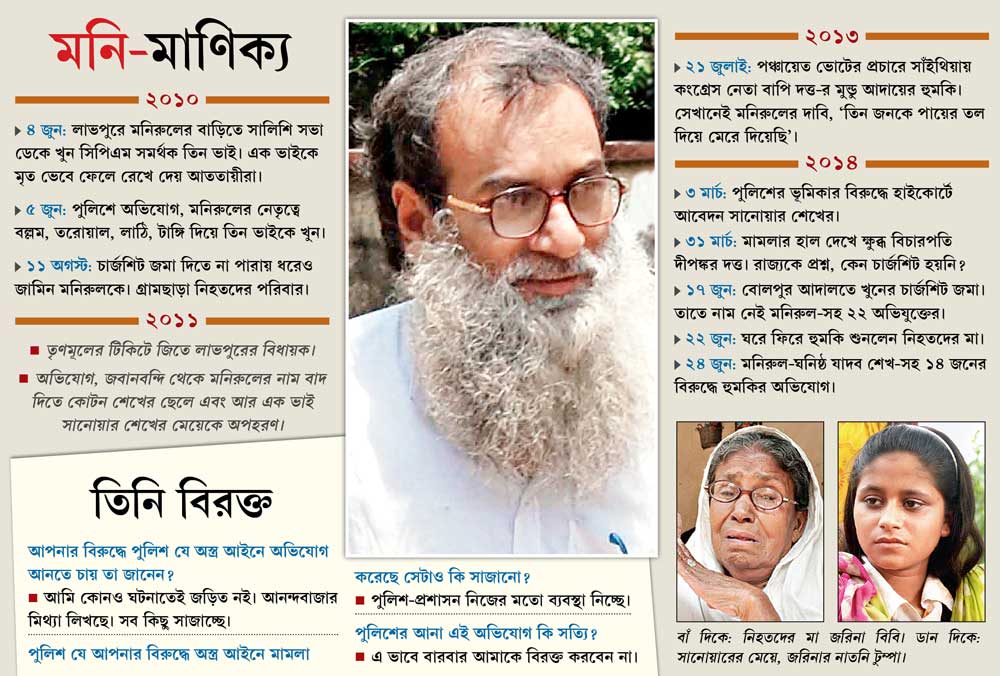 জেলা পুলিশ সূত্রের খবর, ২০১০ সালের ৪ জুন সিপিএম সমর্থক একটি পরিবারের তিন ভাই জাকের আলি, কোটন শেখ এবং ওইসুদ্দিন শেখের খুনের ঘটনায় মাস দুয়েক ফেরার থাকার পরে পুলিশ মনিরুলকে গ্রেফতার করেছিল। পুলিশি হেফাজতে থাকাকালীন মনিরুলের বাড়িতে তল্লাশি চালিয়ে দু’টি বন্দুকও পাওয়া যায়। কিন্তু সে সময় পুলিশ তাঁর বিরুদ্ধে অস্ত্র আইনে কোনও অভিযোগ দায়ের করেনি। উপরন্তু ঠিক সময়ে চার্জশিট দিতে না-পারায় মনিরুল জামিন পেয়ে যান। বিধানসভা নির্বাচনে তৃণমূল তাঁকে লাভপুর কেন্দ্রে দাঁড় করায়। তিনি জিতেও যান। এর পরে মনিরুলের দাপট আরও বাড়ে। খুনের অভিযোগ থেকে মুক্তি পেতে নিহতের পরিবারের উপরে চাপও বাড়ে। সেই চাপের মুখে ম্যাজিস্ট্রেটের কাছে বয়ান দিতে গিয়ে নিহতদের পরিবারের লোকেরা বলেন, ঘটনার সময়ে মনিরুল উপস্থিত ছিলেন না।