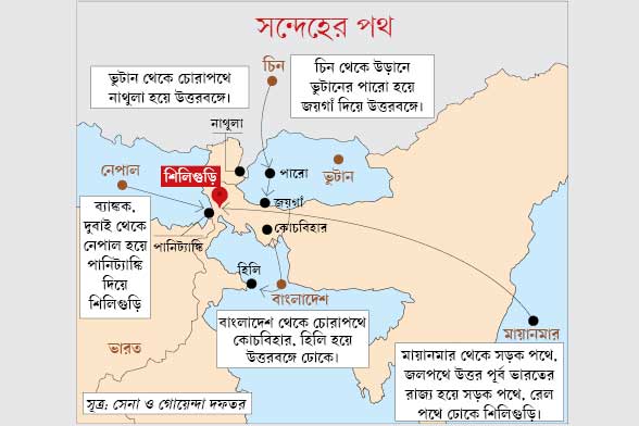 গোয়েন্দাদের একাংশের দাবি, সেই সঙ্গে স্থানীয় দুষ্কৃতীদের একাংশের যোগসাজশে দুর্নীতিতে অভিযুক্ত অফিসার-কর্মীদের তালিকা তৈরি করে তাঁরা। সেই তালিকা ধরে আমদানি-রফতানিকারকের লাইসেন্স জোগাড় করে আলাপ জমায় চোরাকারবারিদের ‘এজেন্ট’। এর পরেই মাসিক বন্দোবস্ত পাকা হলে কবে, কোন পথে তা নিয়ে যাওয়া হবে সেই ‘নীল-নকশা’ তৈরি হয়ে যায়। এমন অন্তত ৮টি আন্তর্জাতিক সোনা পাচার চক্রের জাল উত্তরবঙ্গের সীমান্ত এলাকায় ছড়িয়ে রয়েছে বলে গোয়েন্দাদের আশঙ্কা। তার বাইরেও নতুন পাচারকারী দল মাথাচাড়া দিচ্ছে বলেও গোয়েন্দারা খবর পেয়েছেন। এঁদের জাল ছড়িয়ে রয়েছে মায়াম্মার, চিন, ভুটান বাংলাদেশ, দুবাই, ব্যাঙ্ককে।