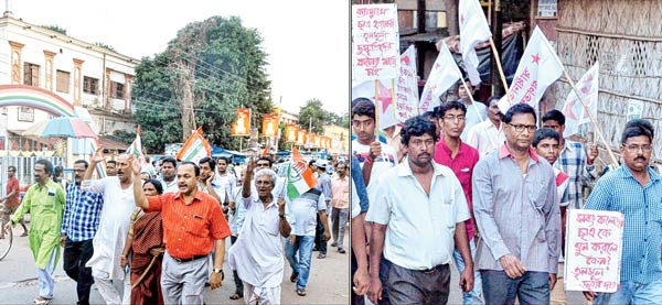 কলেজ ছাত্র কৃষ্ণপ্রসাদ জানার মৃত্যুর ঘটনার প্রতিবাদে মেদিনীপুর শহরে কংগ্রেসের মিছিল (বাঁ দিকে)।
