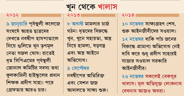 পূর্বস্থলীর তৃণমূল নেতা সজল ঘোষ খুনের মামলায় একটি হাইস্কুলের প্রধান শিক্ষক তথা সিপিএম নেতা প্রদীপ সাহাকে বেকসুর খালাস করল নবদ্বীপ আদালত। তাঁর সঙ্গেই মুক্তি পেলেন আরও চার সিপিএম কর্মী। ফলে, ওই খুনে আসলে কারা জড়িত তার মীমাংসা যেমন হল না, পুলিশের ভূমিকা নিয়েও ফের প্রশ্ন উঠে গেল।