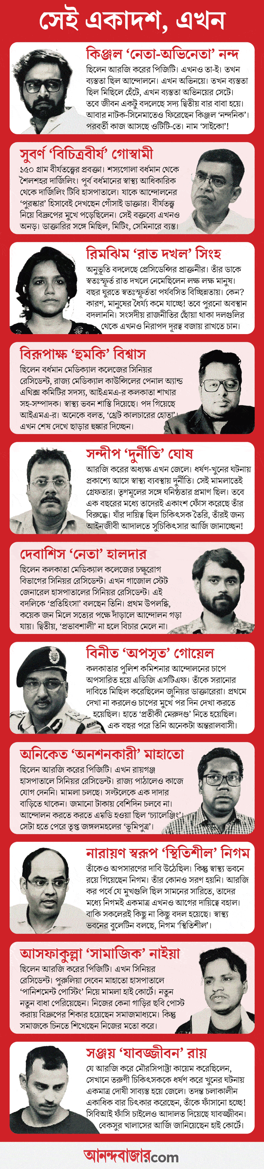 এক বছর আগে আন্দোলন পর্বে জুনিয়র চিকিৎসকদের একাধিক ‘মুখ’ নিছক চিকিৎসক থেকে ‘নেতা’ হয়ে উঠেছিলেন। তাঁদের ডাকে মিছিল, সভা এমনকি, ভরা পুজোর সময়ে অনশন মণ্ডপ ঘিরে জনস্রোতে ভেসে গিয়েছিল ধর্মতলা। সময়ের সঙ্গে সঙ্গে স্তিমিত হয়ে গিয়েছে আন্দোলন।