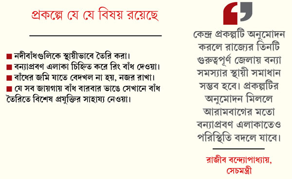 সেচ দফতর সূত্রের খবর, প্রকল্পটি হলে নদীবাঁধগুলিকে স্থায়ী ভাবে তৈরি করা হবে। বন্যাপ্রবণ এলাকাগুলি চিহ্নিত করে সেখানে রিং বাঁধ দেওয়া হবে। বাঁধের জমি যাতে বেদখল না হয় সে দিকে নজর রাখা হবে। একই সঙ্গে যে সব জায়গায় বাঁধ বারবারই ভাঙে সেখানে বাঁধ তৈরির ক্ষেত্রে বিশেষ প্রযুক্তির সাহায্য নেওয়ার কথা ভাবা হচ্ছে। এ ছাড়াও আরও কিছু পদক্ষেপ করা হবে। প্রকল্প রূপায়ণের আগে তা চূড়ান্ত হবে।