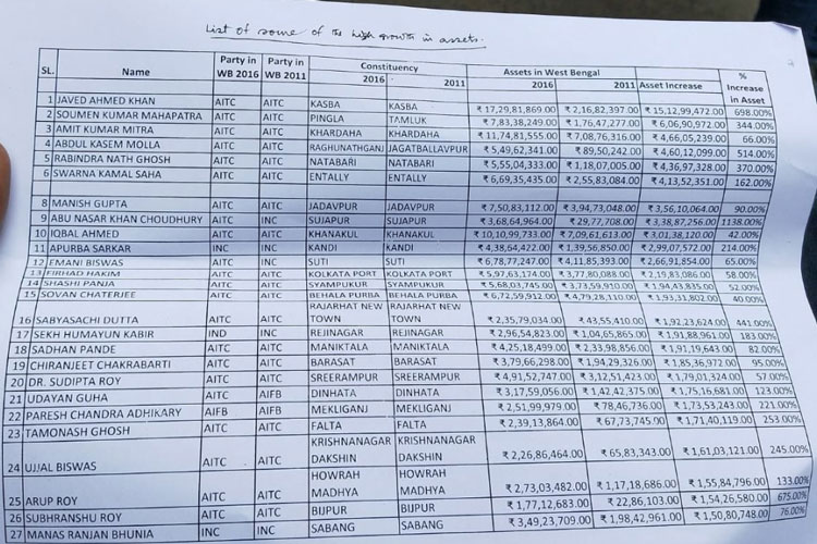 ২০১১ সালে বিধাননগরের মেয়র সব্যসাচী দত্তের সম্পত্তির মূল্য ছিল ৪৩ লক্ষ ৫৫ হাজার ৪১০ টাকা। ২০১৬ সালে তা বেড়ে হয় ২ কোটির বেশি। বৃদ্ধি ৪৪১ শতাংশ। বিজেপি নেতা মুকুল রায়ের পুত্র শুভ্রাংশুর সম্পদের পরিমাণও এক লাফে অনেকটাই বেড়ে গিয়েছে। শুভ্রাংশু এখনও তৃণমূলের বিধায়ক। তাঁর সম্পত্তির পরিমাণ বৃদ্ধি হয়েছে ৬৭৫ শতাংশ।