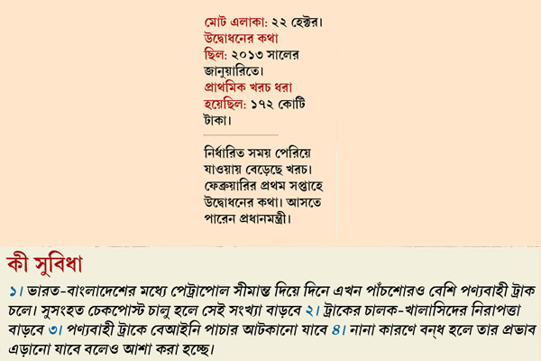 প্রস্তাবিত সুসংহত চেকপোস্ট এলাকায় গিয়ে দেখা গেল, মূল প্রশাসনিক ভবন-সহ বিশ্রামাগার, ঝাঁ চকচকে চওড়া রাস্তা, আলো, ট্রাক রাখার গুদাম ঘর, পণ্য পরীক্ষার জন্য সিকিউরিটি চেক পোস্ট, পার্কিং, কোয়ারেন্টাইন ভবন (পশু খাদ্য ও প্রাণী খাদ্যের গুণগত মান পরীক্ষা করার জায়গা)-সহ বেশির ভাগ কাজই শেষ হয়ে গিয়েছে। সৌন্দর্য্য বাড়ানোর জন্য ঘাস লাগানো হয়েছে। ফুল গাছ পোঁতা হচ্ছে। শুল্ক দফতরের এক কর্তা জানালেন, এখানে এক সঙ্গে দু’হাজার ট্রাক দাঁড়াতে পারবে। এখন শুধু পণ্য আমদানি-রফতানির কাজই হবে। ভবিষ্যতে এখান দিয়ে যাত্রী যাতায়াতের কথা আছে।