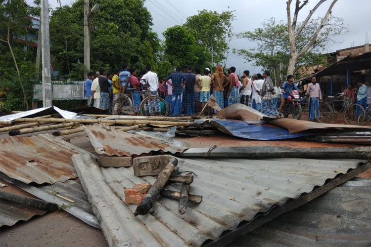 বাঁশ, টিন ফেলে রাস্তা অবরোধ আন্দোলনকারীদের।