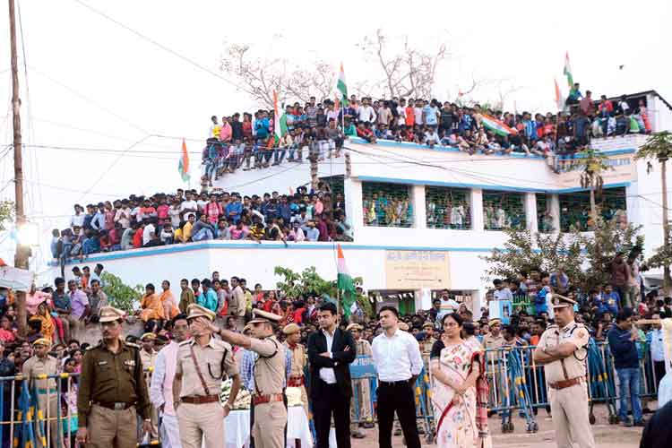ভিড় উপচে পড়েছে এলাকায়। স্থানীয় প্রাথমিক স্কুলের ছাদে, বারান্দায় দাঁড়িয়ে সব বয়সের মানুষ। নিজস্ব চিত্র
