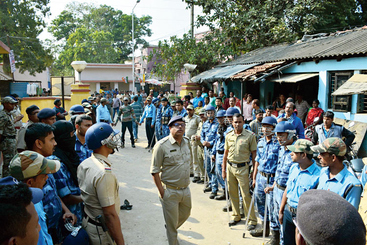 লাভপুর অপহরণ-কাণ্ডে শুনানির জন্য ভিড় সামলাতে বোলপুর আদালতে মোতায়েন বিশাল পুলিশ বাহিনী।