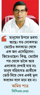 শাসক দলের এই দ্বন্দ্বই সিপিএমকে বাড়তি আশা জোগাচ্ছে ভোটের মুখে। মাসখানেক আগেই বাঁকুড়ার মাচানতলায় দলীয় সমাবেশ অমিয়বাবু বুথে বুথে শক্তি বাড়ানোর নির্দেশ দিয়েছিলেন। এ দিন প্রার্থী হিসেবে তাঁর নাম ঘোষণা হওয়ার পরে অমিয়বাবু বলেন, “মানুষের উপর ভরসা আছে। গত লোকসভা ভোটেও কলকাতা থেকে এক জন এসেছিলেন। জিতেওছেন। কিন্তু, ভোটের পর থেকে তাঁকে আর এলাকায় দেখাই যায় না! মানুষ বহিরাগত প্রার্থীকে ভোট দিয়ে ফের একই ভুল করবেন বলে আমার মনে হয় না।’’
