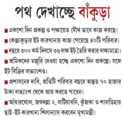 একশো দিনের প্রকল্পে স্থায়ী সম্পদ গড়ে ইতিমধ্যেই নজর কেড়েছে বাঁকুড়া জেলা প্রশাসন। জেলা জুড়ে গড়ে তোলা হয়েছে ২৫৩টি আম বাগান। যা থেকে প্রতি বছর প্রত্যক্ষ ভাবে লাভবান হচ্ছে প্রায় ৫০০টি স্বনির্ভর গোষ্ঠী। এ বার ছাই-ইট নিয়েও প্রবল আশায় শ্রমিকদের পাশে জেলা প্রশাসন।