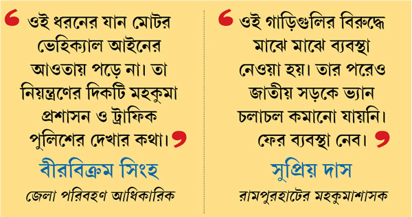 এ দিকে, এলাকার মানুষের প্রশ্ন, যে দুর্ঘটনাটি ঘটল তাতে একটি শিশুর প্রাণ গেল। পরিবহণ দফতর স্বীকৃত যান না হওয়ায় ওই শিশুর পরিবার কোনও আর্থিক ক্ষতিপূরণও পাবে না। তার পরেও পুলিশ-প্রশাসন থেকে নাগরিক— কেউ-ই সচেতন হচ্ছেন না। ওই ধরন যান নিয়ন্ত্রণে কেন ব্যবস্থা নেওয়া হয় না? প্রশ্নের জবাবে মহকুমা প্রশাসন এবং ট্রাফিক পুলিশের ঘাড়েই দায় ঠেলেছেন জেলা পরিবহণ আধিকারিক বীরবিক্রম সিংহ। তাঁর বক্তব্য, ‘‘ওই ধরনের যান মোটর ভেহিক্যাল আইনের আওতায় পড়ে না। ভ্যানগুলি নিয়ন্ত্রণের বিষয়টি মহকুমা প্রশাসন এবং এলাকার ট্রাফিক পুলিশের দেখার কথা।’’ জাতীয় সড়কের উপরে যে মোটরচালিত ভ্যান চলাচল করার কথা নয়, তা মেনে নিয়েছেন এসডিও (রামপুরহাট) সুপ্রিয় দাসও। তিনি মেনেই নিয়েছেন, ‘‘নিষিদ্ধ সত্ত্বেও রামপুরহাট হাসপাতাল পাড়া সংলগ্ন এলাকা বা জাতীয় সড়কের ধারে বেশ কিছু যন্ত্র চালিত ভ্যান চলাচল করে। ওই গাড়িগুলির বিরুদ্ধে মাঝে মাঝে ব্যবস্থা নেওয়া হয়। কিন্তু তার পরেও ভ্যান চলাচল কমানো যায়নি।’’ তবে এ দিনের ঘটনার কথা শুনে এসডিপিও এবং ওসি ট্রাফিকের সঙ্গে কথা বলে আইনানুগ ব্যবস্থা নেওয়ার আশ্বাস তিনি দিয়েছেন। একই আশ্বাস দিয়েছেন শহরের ট্রাফিক অফিসার ইনচার্জ রণজিৎ বাউড়িও।