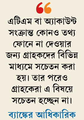 ব্যাঙ্ক কর্তৃপক্ষ বিজ্ঞাপন দিয়ে, মোবাইলে বার্তা পাঠিয়ে বারবার গ্রাহকদের কাছে আবেদন করে, মোবাইলে অজ্ঞাতপরিচয় কাউকেই এটিএম বা অ্যাকাউন্ট সংক্রান্ত কোনও তথ্য না জানাতে। তার পরেও ফাঁদে পা দিয়ে প্রতারণার শিকার হন অনেক গ্রাহকই।