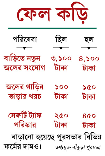ওয়াকিবহাল মহলের মতে, আয় বাড়ানোর জন্য সামান্য সংস্কারের রাস্তায় গিয়ে বিশেষ একটা কিছু সুবিধা করতে পারবে না বাঁকুড়া পুরসভা। কারণ পড়শি জেলার পুরুলিয়া পুরসভাতেও এই সব পরিষেবা পেতে বাঁকুড়ার চেয়ে কয়েক গুণ বেশি টাকা গুনতে হয় পুরুলিয়ার পুরবাসিন্দাদের। এ কথা মেনেও নিচ্ছেন পুরপ্রধান মহাপ্রসাদবাবু। তাঁর অভিমত, যে হারে ফি’ বৃদ্ধি করা হয়েছে তাতে পুরসভার আয় বছরে প্রায় ২ লক্ষ টাকা বাড়বে। তাঁর বক্তব্য, “এক একটি ওয়ার্ডে শুধুমাত্র জলের পরিষেবা ঠিকঠাক রাখতে পাইপ লাইনেরই কাজ হয় প্রায় ১ লক্ষ টাকার। সব কিছুই ভর্তুকি দিয়ে টানতে হচ্ছে। যা পরিস্থিতি তাতে বছরে দু’লক্ষ টাকা আয় বাড়িয়ে আমরা কিছুই সুরাহা করতে পারব না।’’