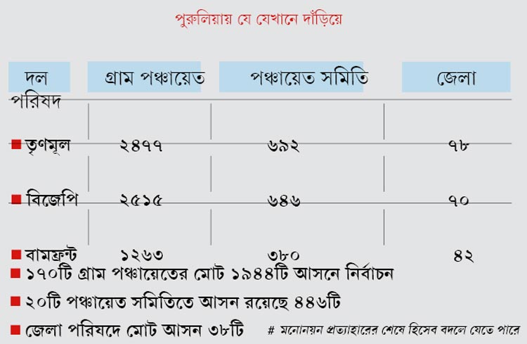 যদিও তৃণমূল নেতৃত্বের দাবি, সংখ্যা গরিষ্ঠতার বিচারে জেলা পরিষদ দখলে রেখে দিচ্ছে তারা। কারণ জেলা পরিষদের ৪৬টি আসনের মধ্যে ২৬টি আসনেই বিরোধীরা কেউ মনোনয়ন দেননি। জেলার ১২টি পঞ্চায়েত সমিতিও একই ভাবে তৃণমূলের হাতে চলে এসেছে।