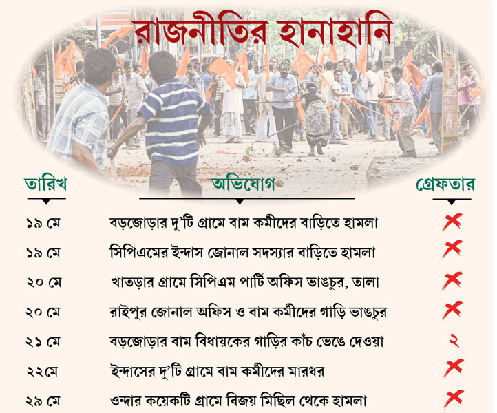 তুষারবাবু জানান, ওই দিন সিপিএমের জেলা সম্পাদকমণ্ডলীর সদস্য মনোরঞ্জন পাত্রকে নিয়ে তিনি বিষ্ণুপুর বিধানসভা কেন্দ্রের অন্তর্গত তালড্যাংরা থানার শালতোড়া, সাতমৌলি ও আমড্যাংরা পঞ্চায়েত এলাকার ভোটারদের সঙ্গে দেখা করতে যান। শালতোড়ার মামড়া গ্রামে দীর্ঘদিন বন্ধ থাকা সিপিএমের একটি পার্টি অফিসও সে দিন তুষারবাবুরা খোলেন। বিষ্ণুপুর ফেরার পথে রাত আটটা নাগাদ শালতোড়ারই একটি চায়ের দোকানে গাড়ি থামিয়ে চা খাচ্ছিলেন তাঁরা। অভিযোগ, আচমকা এক দল তৃণমূল কর্মী দোকানের সামনে জড়ো হয়ে তুষারবাবুদের গালাগালি দিতে শুরু করেন। এই নিয়ে দু’পক্ষের বচসা বাধে। এর পর ইট-পাটকেল নিয়ে হামলা শুরু করে তৃণমূল কর্মীরা।