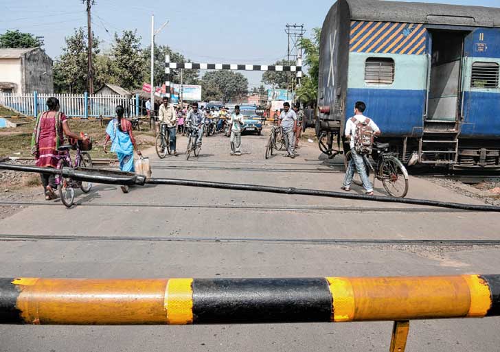 ঝুঁকির পারাপার। সিউড়ির হাটজনবাজারের লেভেল ক্রসিংয়ে। —নিজস্ব চিত্র