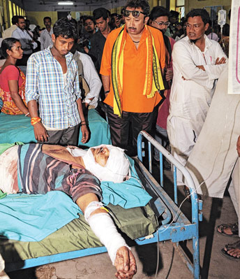 জখমদের দেখতে সিউড়ি হাসপাতালে বিজেপি প্রার্থী জয় বন্দ্যোপাধ্যায়। —নিজস্ব চিত্র