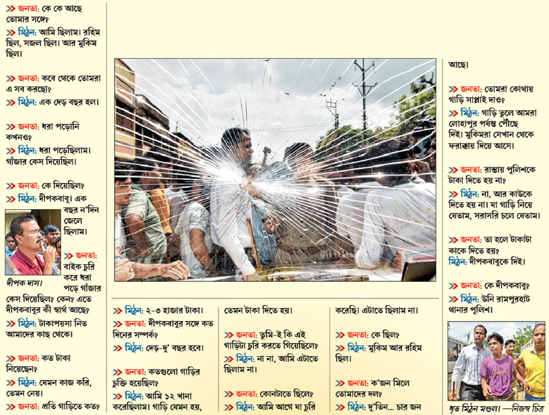 মোটরবাইক চুরি নিয়ে রবিবার সকালে ধুন্ধুমার বাধল রামপুরহাটে। জনতার দাবি, চুরির ঘটনায় সরাসরি রামপুরহাট থানার এসআই দীপক দাসের জড়িত থাকার কথাও জানিয়েছে মিঠুন মণ্ডল নামে এক স্থানীয় যুবক। ঘটনাচক্রে অন্য একটি ঘটনায় এক বছর জেল খেটে শনিবারই বাড়িতে ফিরেছিল মিঠুন। এমন এক ‘অপরাধী’র দাবি মানতেই নারাজ পুলিশ। জেলার পুলিশ কর্তাদের দাবি, জনতার মার খাওয়ার ভয়ে পুলিশের নাম নিয়েছে ওই যুবক। জনতার সঙ্গে মিঠুনের সেই কথোপকথনই হুবহু তুলে ধরল আনন্দবাজার।