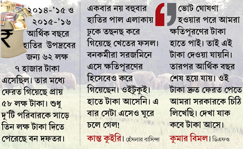 টানা দু’বছর হাপিত্যেশ করে থাকার পরে হাতির হানায় ক্ষতিপূরণের টাকা এল। আবার ঘুরে চলেও গেল।