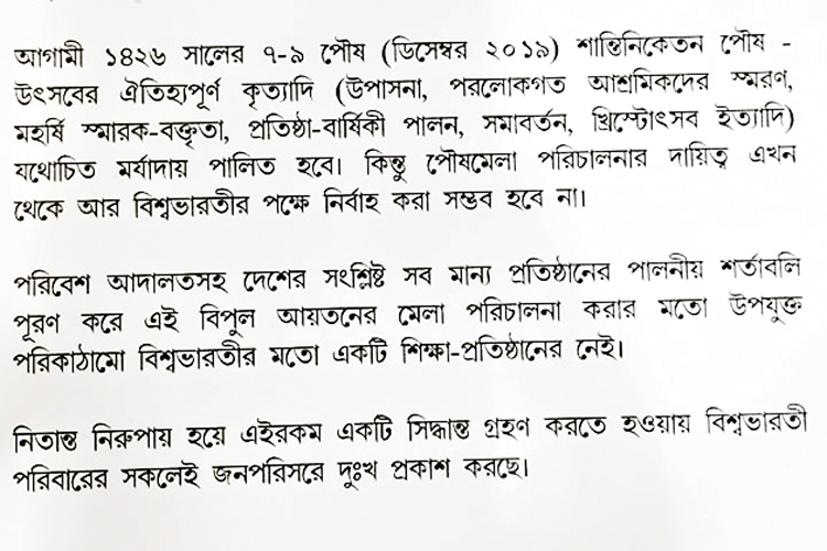 বক্তৃতা, প্রতিষ্ঠা বার্ষিকী পালন, সমাবর্তন, খ্রিস্টোৎসব ইত্যাদি) যথোচিত মর্যাদায় পালিত হবে। কিন্তু পৌষমেলা পরিচালনার দায়িত্ব এখন থেকে আর বিশ্বভারতীর পক্ষে নির্বাহ করা সম্ভব হবে না।’