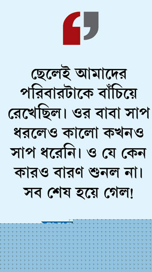 এ দিকে, বাবার মৃত্যুর পরে মা এবং ছোট ভাইকে নিয়ে গোটা সংসারের ভারটাই এসে পড়েছিল কালোর উপর। দিনমজুরি করে ওই যুবকই পরিবারে অন্ন জোগাতেন। সেই ছেলেই এমন বেঘোরে মারা যাবে, তা কিছুতেই মেনে নিতে পারছেন না মা সুষমাদেবী। এ দিন বিকেলে কাঁদতে কাঁদতে তিনি বলেন, ‘‘ছেলেই আমাদের বাঁচিয়ে রেখেছিল। ওর বাবা সাপ ধরলেও কালো কখনও সাপ ধরেনি। ও যে কেন কারও বারণ শুনল না। সব শেষ হয়ে গেল!’’ দিনের শেষে গ্রামবাসীর কাছেই রয়েছে ঘাতক সাপটি। এ ব্যাপারে যোগাযোগ করা হলে বন দফতরের মহম্মদবাজারের রেঞ্জার জ্যোতিপ্রকাশ গুহরায় বলেন, ‘‘আপনার কাছেই ঘটনার কথা প্রথম শুনলাম। দেখে ব্যবস্থা নিচ্ছি।’’