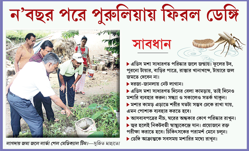 এ দিকে হাসপাতালে আক্রান্ত যুবককে মশারির মধ্যে রাখা হয়েছে। পুরুলিয়া শহরের উপকন্ঠে লাগদা গ্রামে ডেঙ্গির জীবাণু মেলায় বিষয়টিকে যথেষ্ট গুরুত্ব দিয়ে দেখছে স্বাস্থ্য দফতর। কারণ ২০০৭ সালে এই লাগদা গ্রামেই ডেঙ্গির জীবাণুর সন্ধান মিলেছিল।