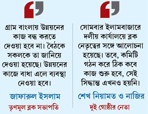 সে কথা মেনে নিয়ে জেলা পরিষদের কর্মাধ্যক্ষ তথা তৃণমূলের ইলামবাজার ব্লক সভাপতি জাফারুল ইসলাম মঙ্গলবার বলেন, “সোমবার ইলামবাজার দলীয় কার্যালয়ে সকলকে ডাকা হয়েছিল। আলোচনা হয়েছে। অবিলম্বে কমিটি করে গ্রামের নিকাশি নালা সংস্কারের কাজ দ্রুত শুরু করার জন্য বলা হয়েছে।” তার পরেও যে দুই বিবাদমান গোষ্ঠীর মধ্যে কোনও গণ্ডগোল দেখা যাবে না কিংবা উন্নয়নের কাজ বন্ধ হবে, তার কি নিশ্চিয়তা রয়েছে? জাফারুলের জবাব, “তিনি যেই হন, গ্রাম বাংলায় উন্নয়ন কাজ বন্ধ করতে দেওয়া হবে না। বৈঠকে সকলকে তা স্পষ্ট ভাবে জানিয়ে দেওয়া হয়েছে। উন্নয়নের কাজ যারা বাধা দেবে, তাদের বিরুদ্ধে প্রশাসন প্রয়োজনীয় ব্যবস্থা নেবে।”