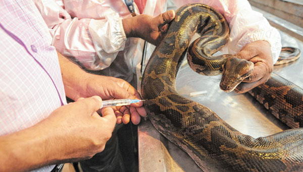 শুক্রবার সকাল ১০টা নাগাদ সিউড়ির লম্বোদরপুর গ্রামের পাম্প হাউস থেকে এই অসুস্থ ময়াল সাপটিকে উদ্ধার করেন শিক্ষক দীনবন্ধু বিশ্বাস।