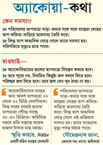 সিউড়ি শহর বা তার আশেপাশে যে বা যাঁরা বাড়িতে রঙিন মাছ রাখেন, সেটা ঘর সাজাতেই হোক বা শখ করে প্রত্যেকেই বলছেন, ‘‘মাছ যে মরে যাচ্ছে! কি করব?’’ একই অবস্থা রঙিন মাছের কারবারীদেরও। সত্যতা মানছে জেলা মৎস্য দফতরও। দফতর সূত্রে জানা গিয়েছে, জলের তাপমাত্রা বেড়ে যাওয়ায় শুধু পুকুরের মাছ নয়, মরে যাচ্ছে অ্যাকোরিয়ামের মাছও।