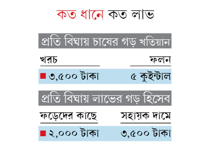 সম্পন্ন চাষিদেরই লাভ সোমবারই উলিয়াড়ার প্রকাশ সমবায় সমিতি জানিয়েছে, মঙ্গলবার থেকে সেখানে সরকারি দামে ধান কেনা হবে। ঝুলেছে নোটিস। টাঙানো হয়েছে প্ল্যাকার্ড। মাইক নিয়ে এলাকায় ঘুরে ঘুরে বলেও বেড়ানো হচ্ছে খবরটা। ম্যানেজার তপন গঙ্গোপাধ্যায় জানান, সমিতিতে ২৯টি গ্রামের কৃষকেরা রয়েছেন। এক কুইন্টাল চালের দাম মিলবে ১৭৫০ টাকা। গত বারের তুলনায় কড়কড়ে দু’শো টাকা বেশি।