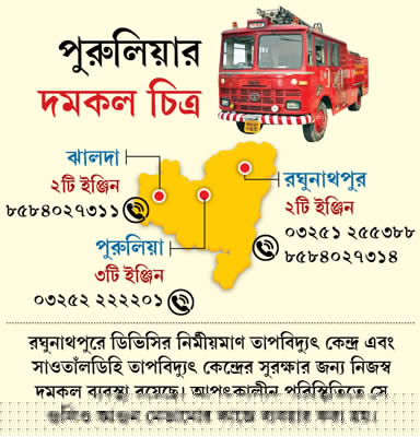 পুরুলিয়ার দমকল কেন্দ্রে ৩টি ইঞ্জিন রয়েছে। গত জানুয়ারিতে ঝালদায় একটি দমকল কেন্দ্র চালু করা হয়েছে। সেখানে রয়েছে ২টি ইঞ্জিন। কিন্তু এই দু’টি কেন্দ্রের আওতায় রয়েছে মোট ১৫টি থানা। এই পরিস্থিতিতে, জেলার দক্ষিণ অঞ্চলে অগ্নি সুরক্ষা কার্যত নেই বললেই চলে।