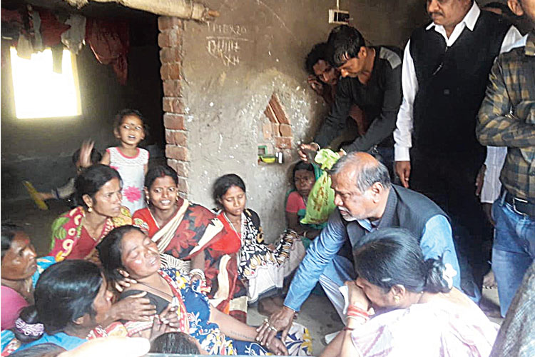 রবিবার দুপুরে পাত্রসায়রের আখড়াশোল গ্রামে রাস্তার পাশে খুঁড়ে রাখা গর্তে মাটি চাপা পড়ে মৃত্যু হয় তিন বালিকার। জখম আরও দু’জন। সম্পর্কে তারা সবাই তুতো ভাইবোন। সোমবার সকালে গ্রামে ঢোকার বেশ কিছুটা আগে থেকেই কানে আসছিল কান্নার রোল। ভোরেই গ্রামে পৌঁছে গিয়েছিলেন পাত্রসায়র পঞ্চায়েত সমিতির সভাপতি পার্থপ্রতিম সিংহ। ব্লক তৃণমূলের পক্ষ থেকে মৃতদের পরিবারকে দশহাজার টাকা করে দেওয়া হয়।