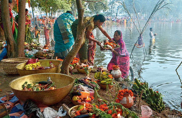 রবিবার দুপুর তিনটে থেকে বিভিন্ন ছটঘাটে লোক সমাগম হতে থাকে। সূর্য অস্ত যাওয়া পর্যন্ত জলে নেমে দুধ, গঙ্গাজল নিবেদন করেন ভক্তেরা। সোমবার ভোরে সূর্য ওঠার সময় আরও একবার অর্ঘ্য নিবেদন করা হয়। এই উপলক্ষে গোটা ডাব, আখ, পাঁচ রকম ফল, ঠেকোয়া বিভিন্ন উপাচার কুলোয় সাজিয়ে, সেই কুলো মাথায় নিয়ে হাঁটতে হাঁটতে ছটঘাটে আসেন। নানা ছটঘাটে এই উপলক্ষে আলো, কলাগাছ এবং ফুল দিয়ে সাজানো হয়।