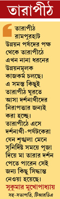 এসব প্রশ্নে তারাপীঠ রামপুরহাট উন্নয়ন পর্ষদের সহকারি সভাপতি সুকুমার মুখোপাধ্যায়ের দাবি, ‘‘তারাপীঠ রামপুরহাট উন্নয়ন পর্ষদের পক্ষ থেকে তারাপীঠে এখন নানা ধরনের উন্নয়নমূলক কাজ কর্ম চলছে। এ সমস্ত কিছুই তারাপীঠ ঘুরতে আসা দর্শনার্থীদের নিরাপত্তার জন্যই করা হচ্ছে।’’ তাঁর দাবি, তারাপীঠে এসে দর্শনার্থী-পর্যটকরা যেন শৃঙ্খলা মেনে সুনির্দিষ্ট সময়ে পুজা দিয়ে মা তারার দর্শন পেতে পারেন সেই জন্য কিছু সিদ্ধান্ত নেওয়া হয়েছে।