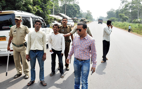 দুই চাঁদা আদায়কারীকে ধরে নিয়ে আসছেন বিষ্ণুপুরের এসডিপিও।—নিজস্ব চিত্র