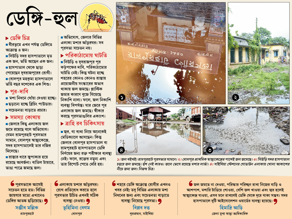 পুরসভা বা পঞ্চায়েতের উদ্যোগে কোথাও কোথাও এলাকার জলা জঙ্গল যেমন পরিষ্কার পরিচ্ছন্ন করা হচ্ছে তেমনই মশার নিধনে নেওয়া হচ্ছে বিশেষ উদ্যোগ। বোলপুর পুরসভার উদ্যোগে ইতিমধ্যে স্থানীয় ওয়ার্ড কাউন্সিলরদের মশা নিধন তেল দিয়েছেন পুর কর্তৃপক্ষ। মহকুমা হাসপাতালের সুপার অমিত মজুমদার এবং স্বাস্থ্য দফতরের চিকিৎসক এবং সেবিকাদের নিয়ে কাউন্সিলরদের সঙ্গে সচেতনতা বৈঠকও হয়েছে। প্রাথমিক ভাবে জ্বরের উপসর্গ দেখা দিলে, চিকিৎসকের পরামর্শ নেওয়া এবং প্রয়োজনীয় রক্ত পরীক্ষা এবং রক্তের নমুনা সংগ্রহের ওপর জোর দিচ্ছেন সুপার। এমন উদ্যোগের পাশে রয়েছে জল জমা ও রাস্তার ধারে আবর্জনা ছড়িয়ে থাকার ছবিও।