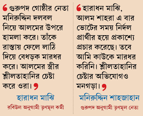 রবিউলের অনুগামী তৃণমূল কর্মী হারাধন মাঝির অভিযোগ, “বৃহস্পতিবার সন্ধ্যায় আলম তাঁর স্ত্রী-কে নিয়ে ডাক্তার দেখাতে নিয়ে যাচ্ছিলেন। সেই সময় গুরুপদ গোষ্ঠীর নেতা শেখ বাবলু ওরফে মনিরুদ্দিন শাজাহান দলবল নিয়ে তাঁর উপরে হামলা করে। রাস্তাতেই তাঁকে লাঠি দিয়ে বেধড়ক পেটানো হয়। তাঁর স্ত্রী-র শ্লীলতাহানির চেষ্টা করেছে ওরা।” তাঁর দাবি, তাঁরা রবিউল হোসেনের ঘনিষ্ঠ। তাই তাঁরা নির্দল প্রার্থীর হয়ে ভোট করেছেন, এই অভিযোগ তুলে কয়েকদিন ধরেই মারধরের হুমকি দেওয়া হচ্ছিল। এ বার সরাসরি হামলা চালানো হল।