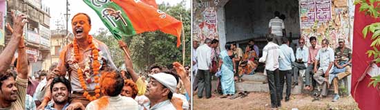 দুই চিত্র। বোলপুরে দলীয় কর্মী সমর্থকদের কাঁধে বিজেপি প্রার্থী বিকাশ মিশ্র।