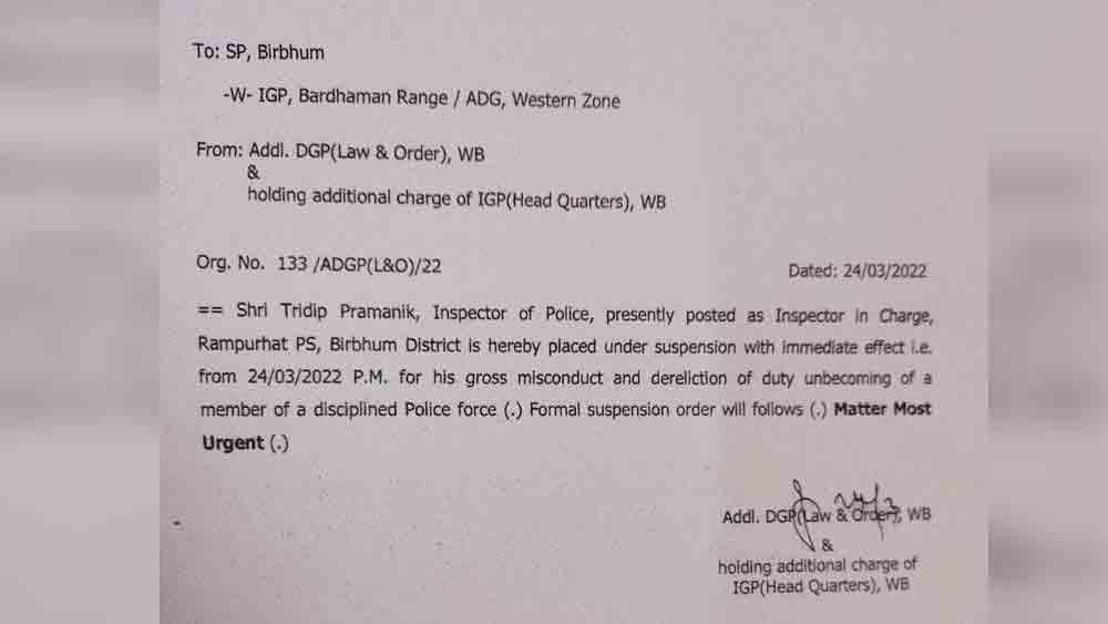 রামপুরহাট থানার আইসি ত্রিদীপ প্রামাণিককে সাসপেন্ড করা হয়েছে। ঘটনার পরই তাঁকে বসিয়ে দেওয়া হয়েছিল। তাঁর বিরুদ্ধে তদন্ত শুরু হয়। তদন্তে কর্তব্যে গাফলতির অভিযোগ প্রমাণিত হয়েছে বলে পুলিশ সূত্রে জানা গিয়েছে। এর পরই তাঁকে সাসপেন্ড করা হয়।
