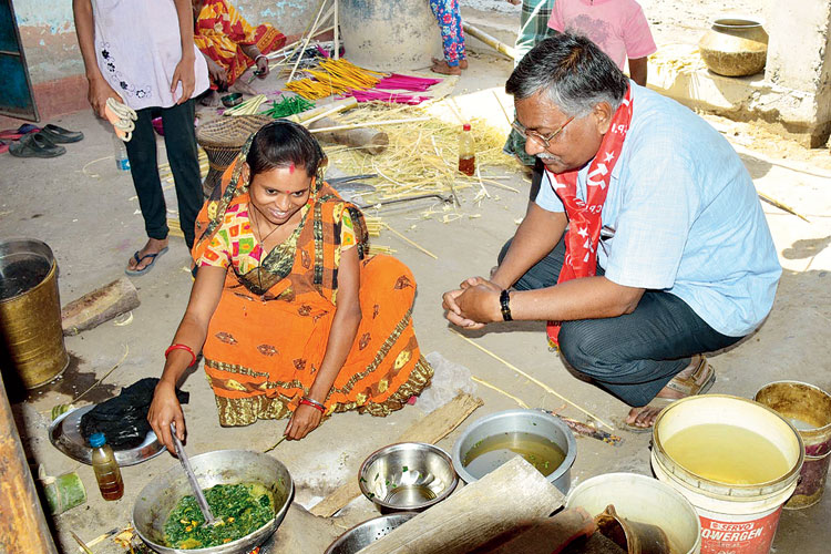 পরামর্শ: রবিবাসরীয় প্রচারে হেঁশেলে ঢুঁ বোলপুর আসনের বামপ্রার্থী রামচন্দ্র ডোমের। ছবি: বিশ্বজিৎ রায়চৌধুরী।