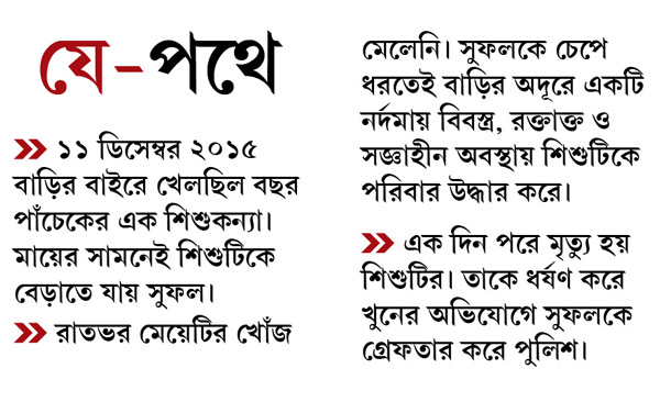 সরকারি আইনজীবী জানান, গত ডিসেম্বরের ১১ তারিখ বিকালে বাড়ির বাইরে খেলছিল বছর পাঁচেকের ওই শিশু। মায়ের সামনেই শিশুটিকে কোলে নিয়ে বেড়াতে চলে যায় কাকা সুফল। সন্ধ্যা নামলেও মেয়ে ঘরে না আসায় উদ্বিগ্ন হয়ে উঠেন মেয়েটির মা। মেয়ে কোথায়? দেওরকে সে প্রশ্ন করলেও সদুত্তর মেলেনি। রাত পার হয়ে এলেও মেয়েকে না পেয়ে সুফলের উপরই সকলের সন্দেহ হয়। তখনই সকলে চেপে ধরেন সুফলকে। প্রথমটায় সব অস্বীকার করলেও শেষে মুখ খোলে সুফল। তার কথা মতো বাড়ির অদূরে ধানকল লাগোয়া নর্দমায় বিবস্ত্র, রক্তাক্ত ও সংজ্ঞাহীন অবস্থায় শিশুটিকে উদ্ধার করে পরিবার। সেখান থেকে তাকে প্রথমে বোলপুরের সিয়ান মহকুমা হাসপাতাল, পরে বর্ধমান মেডিক্যাল কলেজে স্থানান্তরিত করা হয়। একদিন পরে মৃত্যু হয় শিশুটির।