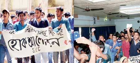 ওই পড়ুয়াদের দাবি, তাঁরা যাতে দাবিপত্র দিতে না পারেন, সে জন্য সম্মানীয় অতিথিদের না আসার ব্যবস্থা করেছেন ভারপ্রাপ্ত অধ্যক্ষ। ক্ষুব্ধ ছাত্রছাত্রীরা ‘হোকআলোড়ন’ লেখা ব্যানার নিয়ে স্লোগান তুলে কলেজ চত্বর মিছিল করার পাশাপাশি রস্কার বিতরণী অনুষ্ঠানের হলেও ঢুকে পড়েন। ভারপ্রাপ্ত অধ্যক্ষ মহাদেব চন্দ্রের পদত্যাগও দাবি করতে থাকেন তাঁরা। অভিযোগ, আন্দলনে যোগ দেওয়া ছাত্রদের সঙ্গে তিনি শিক্ষকসুলভ আচরণ করেননি।