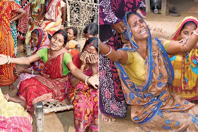 কান্নায় ভেঙে পড়েছেন নিহত অজিতবাবুর স্ত্রী (বাঁ দিকে) লিচুদেবীর শোকার্ত পরিজনেরা। নিজস্ব চিত্র