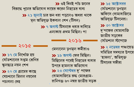 নাবালক খুনের দেড় বছর পরেও মূল অভিযুক্তের টিকি ছুঁতে পারেনি পুলিশ। ঘটনার পরেপরেই যে চার জনকে পুলিশ গ্রেফতার করেছিল তারাও এখন জামিন পেয়ে দাপিয়ে বেড়াচ্ছে এলাকা। নাবালকের পরিবারের সমর্থক তৃণমূল কর্মীদের সঙ্গে গত কয়েক মাসে দফায় দফায় সংঘর্ষ হয়েছে খুনে অভিযুক্ত দুষ্কৃতীদের। জাতীয় সড়ক অবরুদ্ধ করে চলেছে দু’পক্ষের বোমাবাজি— স্তব্ধ হয়েছে জনজীবন। পুলিশ এসে তখনকার মতো পরিস্থিতি সামাল দিলেও কয়েক দিনের মধ্যেই সোঁতশাল ফিরেছে চেনা গোলমালেই! সেই ছবি বজায় রেখে বৃহস্পতিবার আবার অশান্ত হল মহম্মদবাজারের এই এলাকা।