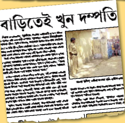 ঘরের সেন্টার টেবিলে ছড়িয়ে কাজু বরফি, ভুজিয়া। স্টিলের গ্লাসে জল। টিভি চললেও সে দিকে নজর নেই কারও। যাঁরা টিভি চালিয়েছিলেন, মেঝে ভেসে যাচ্ছিল তাঁদেরই রক্তে। বিছানায় পড়ে কর্তার দেহ, মেঝেতে গিন্নির। দু’জনেরই গলা কাটা, শরীরের একাধিক জায়গায় ধারালো অস্ত্রের কোপ।