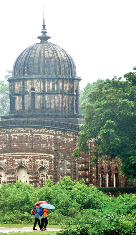 বন্ধ: বৃষ্টি হলেও ছুটির দিন। বিষ্ণুপুরে রাধেশ্যাম মন্দিরে হাজির পর্যটক। ছবি: শুভ্র মিত্র