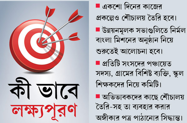 প্রাথমিক ভাবে তার ছক তৈরি হয়েছে। এত দিন উন্নয়নমূলক সভাগুলিতে একশো দিনের কাজের প্রকল্প, কেন্দ্র ও রাজ্য সরকারে বিভিন্ন তহবিলের অর্থ খরচ— এই ধরনের আলোচনার পরে সময় থাকলে নির্মল বাংলা মিশনের অগ্রগতি নিয়ে আলোচনা হত। এ বার থেকে আলোচনার প্রথমেই থাকবে নির্মল বাংলা মিশনের অগ্রগতি। একশো দিনের কাজের প্রকল্পেও শৌচালয় তৈরি করা হবে বলে সিদ্ধান্ত হয়েছে। শৌচালয় ব্যবহার করা হচ্ছে কিনা, সেটা দেখবে সংসদস্তরের নজরদারি কমিটি।