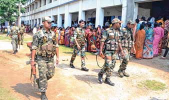 বিষ্ণুপুরের খেমকা হাইস্কুলের বুথে (১৯ নম্বর ওয়ার্ড) পাহারায় বাহিনী। ছবিটি তুলেছেন উমাকান্ত ধর।