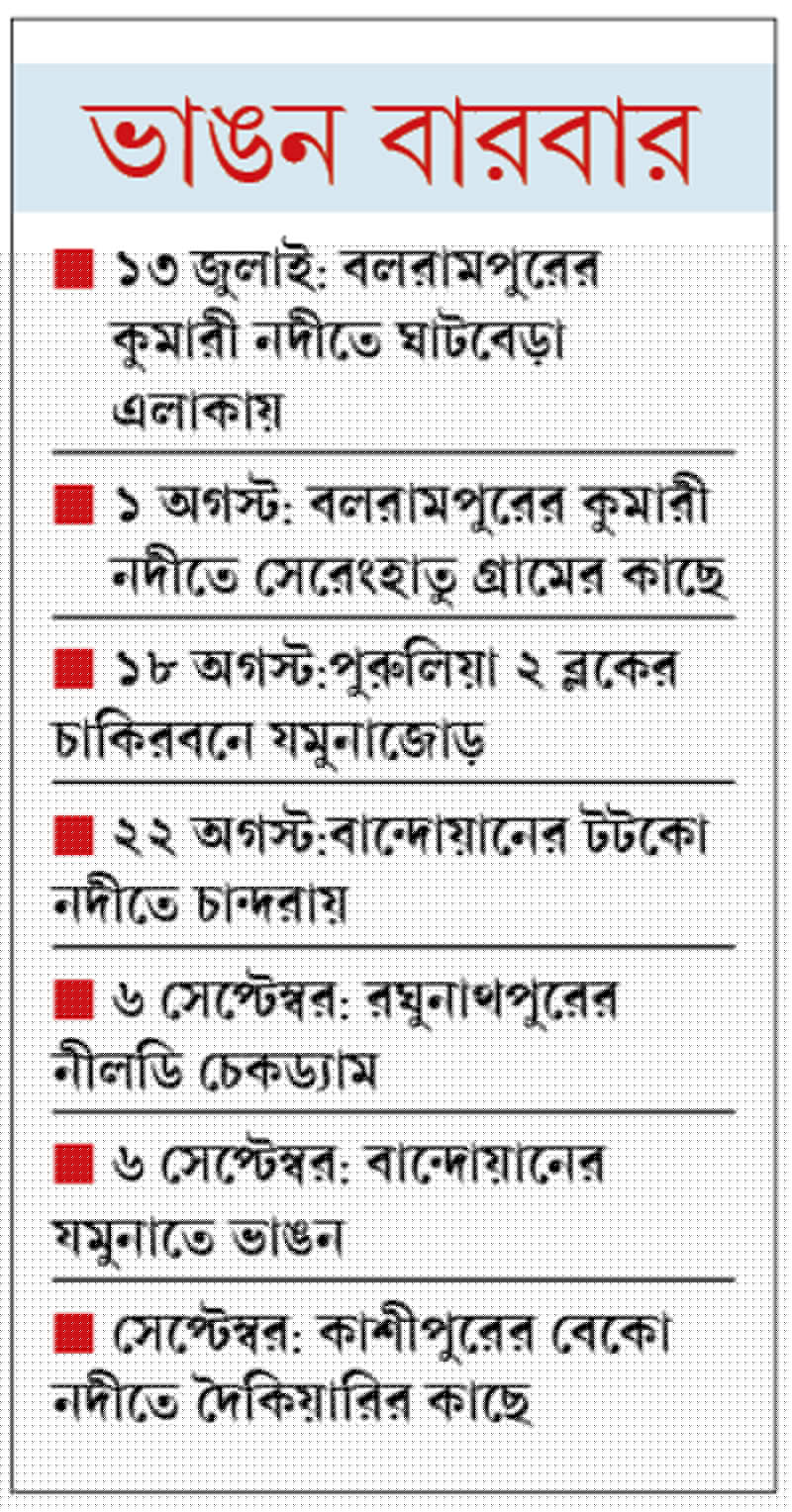 কিন্তু জুলাইয়ের দ্বিতীয় সপ্তাহ থেকে সেপ্টেম্বরের প্রথম সপ্তাহ পর্যন্ত বিভিন্ন সময়ে বড় বৃষ্টিতে একের পর এক চেকড্যাম ভাঙতে থাকে বিভিন্ন ব্লকে। বিশেষত চেকড্যামগুলির গার্ডওয়াল ভেঙে যায় বেশিরভাগ জায়গাতেই। কেথাও মূল ড্যামও ক্ষতিগ্রস্ত হয়। জুলাইয়ে বলরামপুরের কুমারী নদীর উপরে নির্মীয়মান চেকড্যামের গার্ডওয়াল ভেঙে যায়। অগস্টের প্রথম সপ্তাহে ফের বলরামপুরের কুমারী নদীর উপরে নির্মীয়মান আরও একটি চেকড্যামের গার্ডওয়াল ভেঙে পড়ে জলের তোড়ে। এরপরে কয়েক ঘণ্টার টানা বৃষ্টির জলের তোড়ে পুরুলিয়া ২ ব্লকের চাকিরবনে যমুনাজোড়, বান্দোয়ানের টটকো নদী, রঘুনাথপুরের নীলডি চেকড্যাম, কাশীপুরের দৈকিয়ারির কাছে বেকো নদীর উপরে নির্মিত চেকড্যামের গার্ডওয়াল ভেঙে যায়।